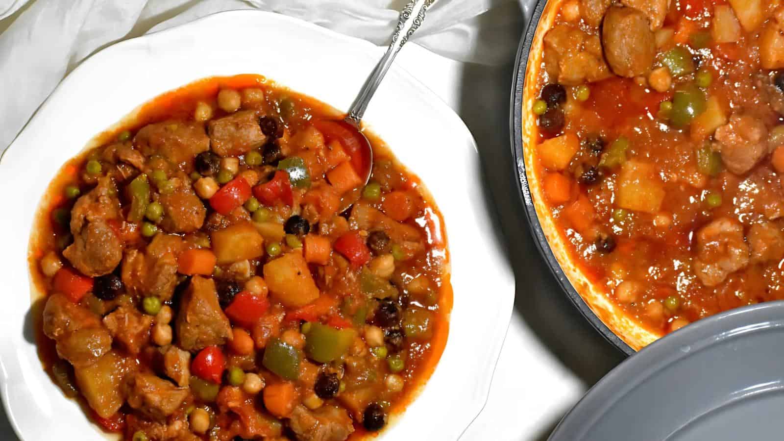 A classic pork stew with a tomato-based sauce, this dish is packed with potatoes, carrots, and bell peppers for a hearty meal. It's a great choice for feeding a crowd or preparing ahead of time. Its rich flavor and simple preparation make it a favorite for any occasion.