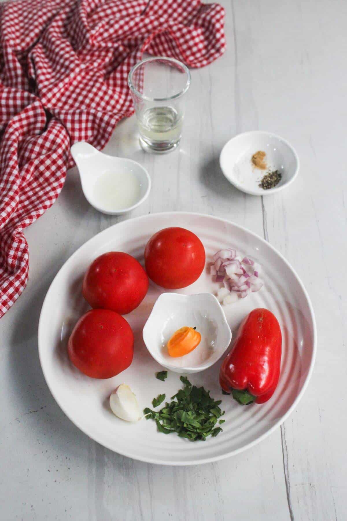 - In a personal blender, pour lime juice and oil. Add onions, garlic, habanero with seeds, cilantro, ginger, salt, black pepper, and half of the diced tomatoes and bell pepper.